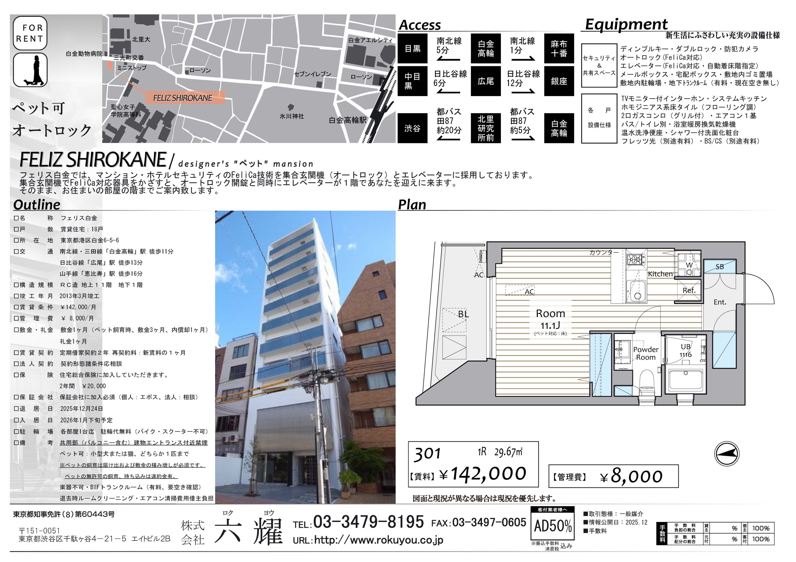 | 交通 | 南北線・三田線「白金高輪」駅 徒歩11分 日比谷線「広尾」駅 徒歩13分 山手線「恵比寿」駅 徒歩16分 |